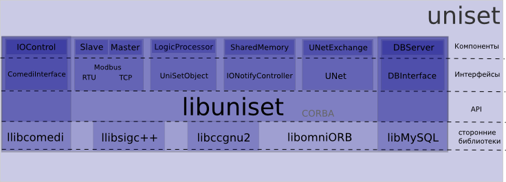 Основной целью библиотеки libuniset является предоставление готовых "кубиков", для построения АСУ. Графически её можно представить так: