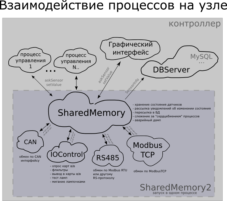 Центральным элементом системы является SharedMemory - это процесс, осуществляющий хранение состояния всех датчиков. Всё взаимодействие между процессами осуществляется через него. Помимо этого SharedMemory осуществляет рассылку уведомлений процессам об изменении состояния того или иного датчика.