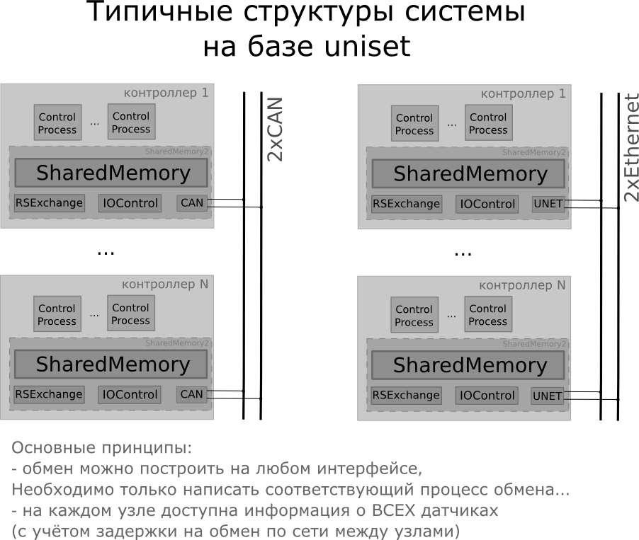 Для обеспечения "прозрачности сети" всё взаимодействие построено на использовании SharedMemory (SM), хранящей состояние датчиков во ВСЕЙ системе. При этом на каждом узле запускаться своя копия SM. "прозрачность" при этом обеспечивают процессы обмена между узлами по соответствующему протоколу (на рисунке это CAN и UNET). Узлы постоянно обмениваются между собой датчиками обеспечивая "одинаковость" хранимой в SM информации. Каждый процесс обмена получает от других узлов информацию о находящихся у них датчиков, и в свою очередь посылает другим узлам информацию о датчиках находящихся у него на узле.